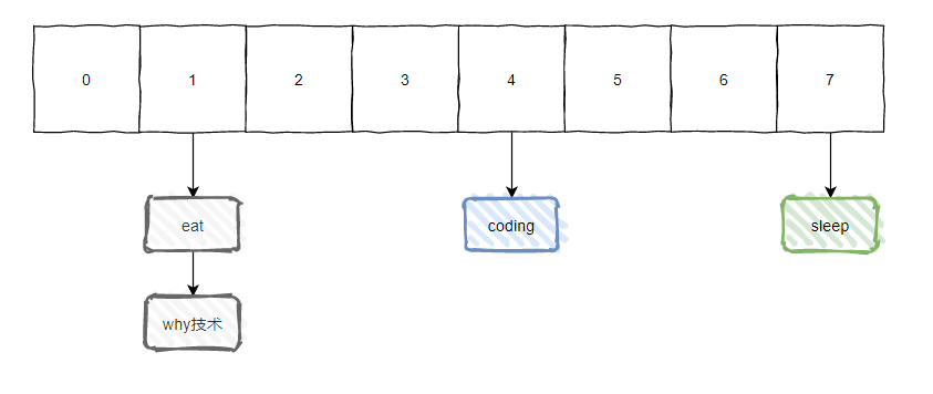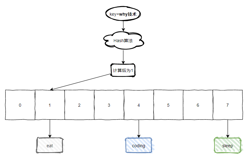 假设现在我们有个值为 [why技术] 的 key,经过 Hash 算法后,计算出值为 1,那么含义就是这个值应该放到数组下标为 1 的地方。