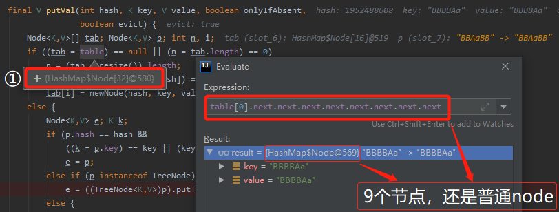 标号为 ① 的地方是计算 key ,也就是 student 对象的 hashCode。而我们 student 对象并没有重写 hashCode,所以调用的是默认的 hashCode 方法。
