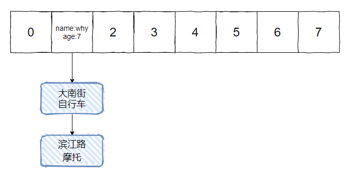 初始状态下,HashMap 中已经有一个名叫 why 的 7 岁小朋友了,他家住大南街,家里的交通工具是自行车。