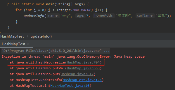 因为每一次都是 new 出来的 student 对象,hashCode 都不尽相同,所以会不停的触发扩容的操作,最终在 resize 的方法抛出了 OOM 异常。