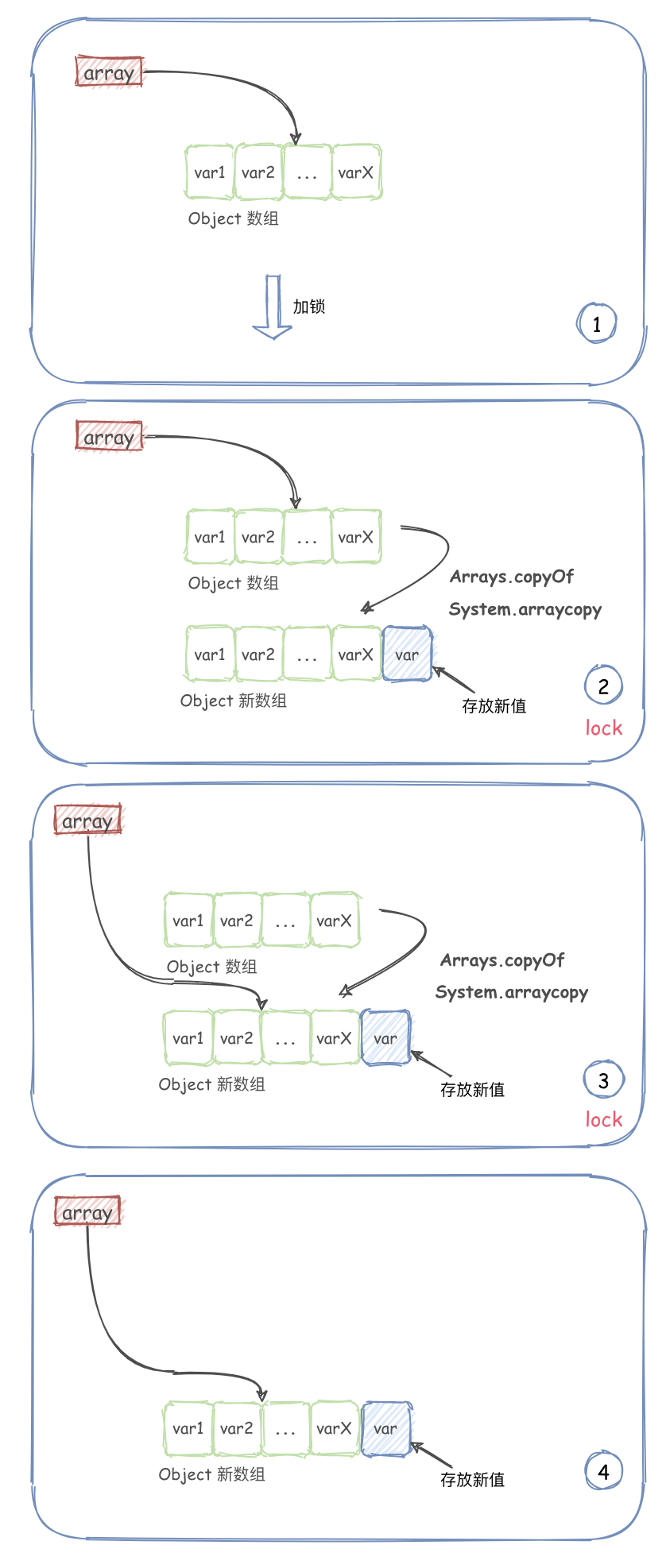 A: 在 add、remove 操作时会进行加锁,然后复制出来一个新数组,操作的都是新数组,而此时原数组是可以提供查询的。当操作结束之后,会将对象指针指向新数组。