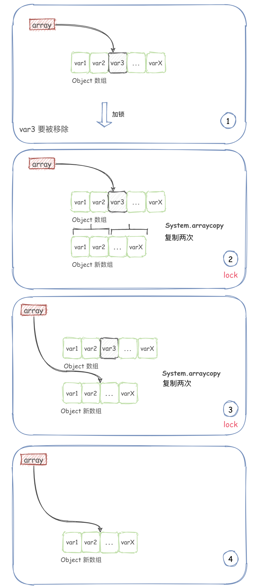 如果移除的是中间的元素,则需要进行两次复制,然后指向新数组。