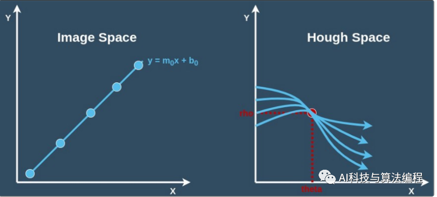 理论上,霍夫变换就是对于原图上的每一个直线都在参数空间画一条线,最终找出参数空间变换线比较密集的地方在对应回到xy 空间坐标系。为了方便理解,下面简单写了一下草稿,希望对你有帮助。
