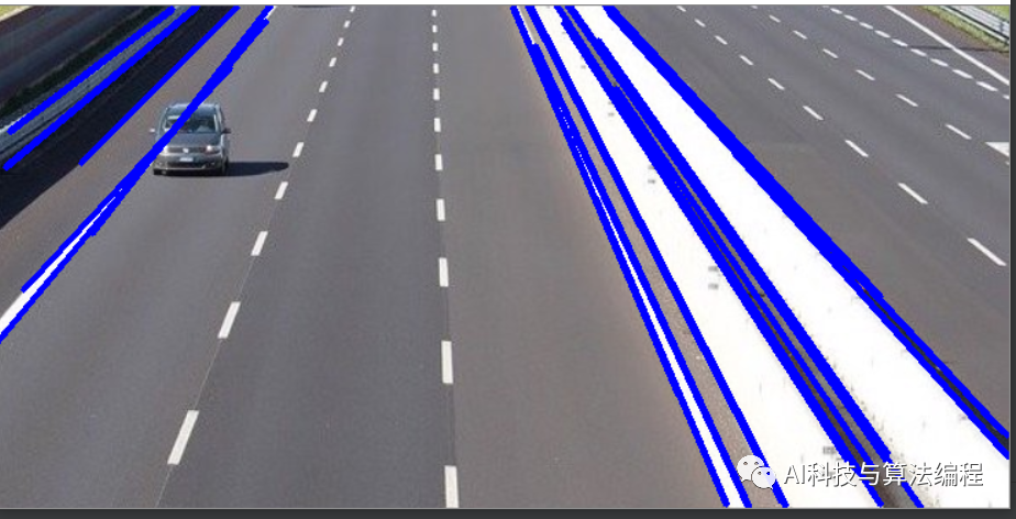 # 另一解法:import cv2import numpy as np# Read imageimg = cv2.imread('lane.jpg', cv2.IMREAD_COLOR)# Convert the image to gray-scalegray = cv2.cvtColor(img, cv2.COLOR_BGR2GRAY)# Find the edges in the image using canny detectoredges = cv2.Canny(gray, 50, 200)# Detect points that form a linelines = cv2.HoughLinesP(edges, 1, np.pi/180, 100,minLineLength=10, maxLineGap=250)# Draw lines on the imagefor line in lines:x1, y1, x2, y2 = line[0]cv2.line(img, (x1, y1), (x2, y2), (255, 0, 0), 3)# Show resultcv2.imshow("Result Image", img)cv2.waitKey() ##记得写上,否则闪退cv2.destroyAllWindows()