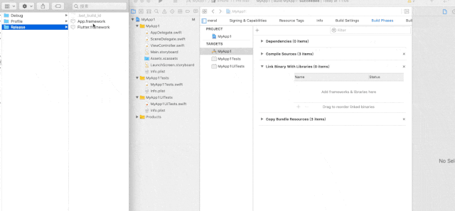 将 App.framework 和 Flutter.framework 拖入Build Settings > Build Phases > Link Binary With Libraries:
