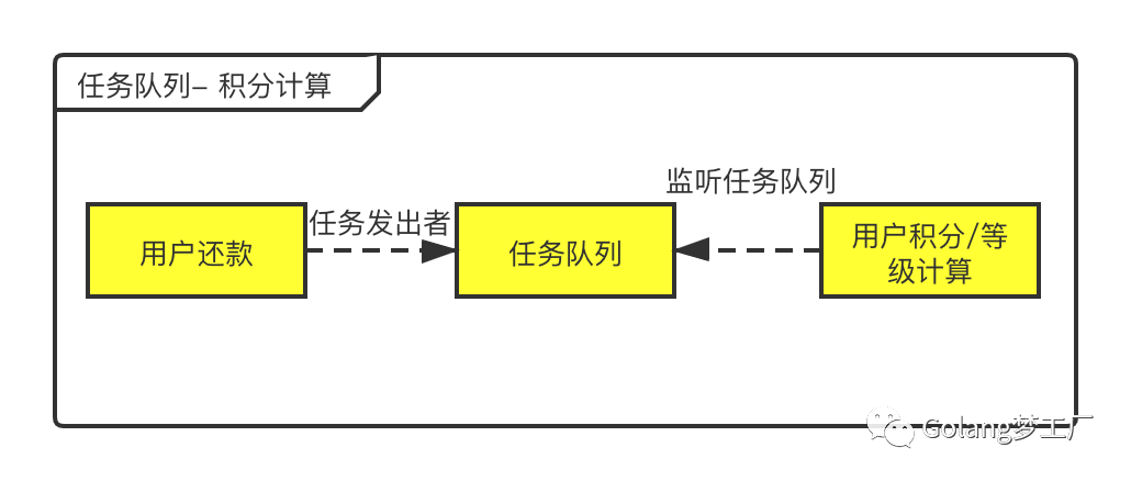 任务队列是用来执行一个耗时任务。大家可能都使用过马爸爸的花呗,每当我们还款时,就会增加自己的芝麻信用分。这就可以用到任务队列来计算用户的积分和等级了。架构简化如下: