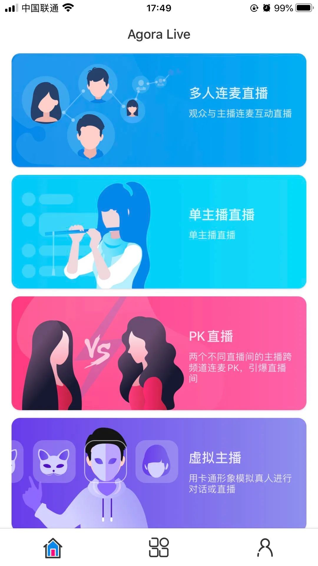 虚拟主播场景:与单主播直播场景类似,只不过 App 会为主播生成一个实时的虚拟形象,虚拟形象的表情会与主播同步。在直播过程中,还可以邀请观众上麦。