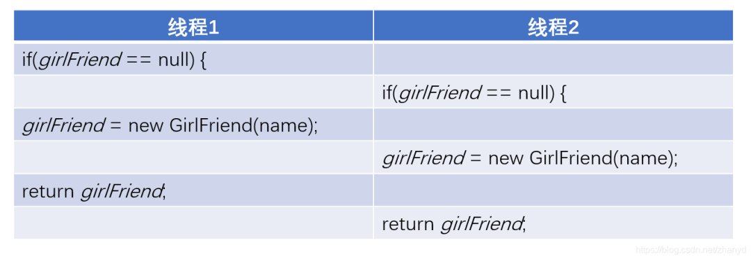 线程1和线程2判断girlFriend的时候如果都为空,就会各自创建一个对象,最后就会返回两个不同的对象了。