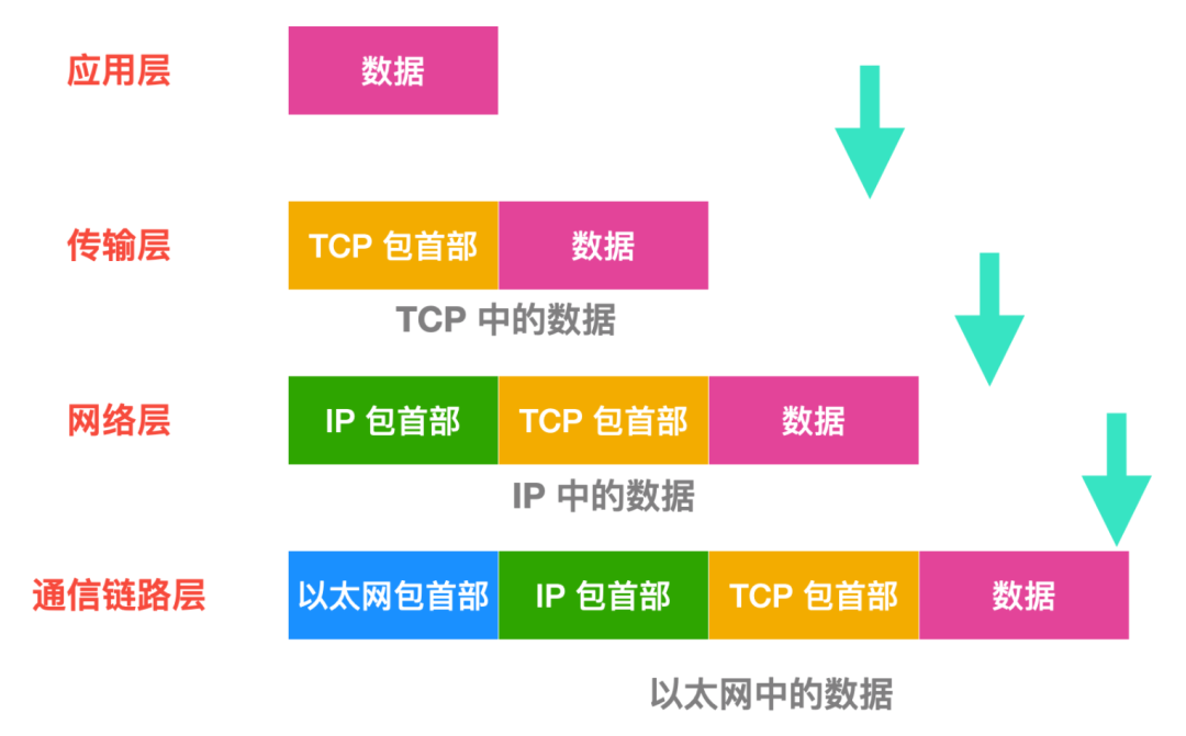 在数据包的发送过程中,各层依次对数据包添加了首部信息,每个首部都包含发送端和接收端地址以及上一层的协议类型。以太网会使用 MAC 地址、IP 会使用 IP 地址、TCP/UDP 则会用端口号作为识别两端主机的地址。
