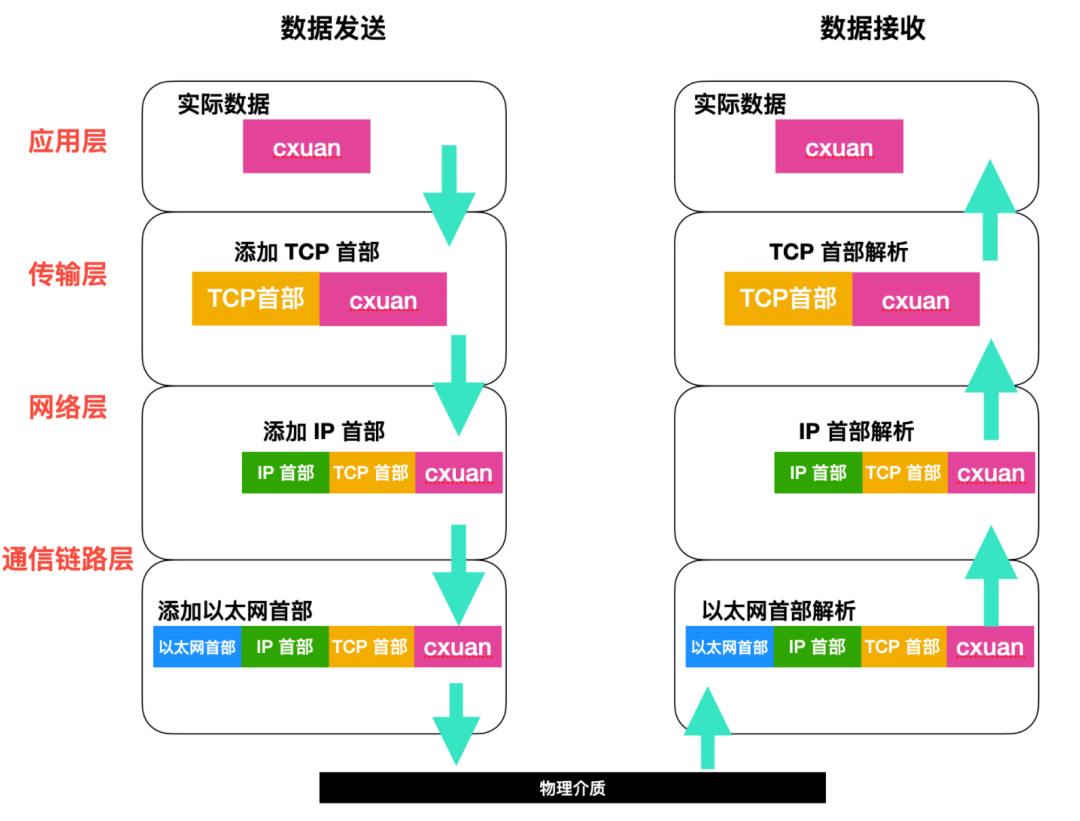 如上图所示,左侧是数据的发送处理过程,应用层的数据经过层层处理后会变为可以发送的数据包,经过物理介质发送至指定主机中。