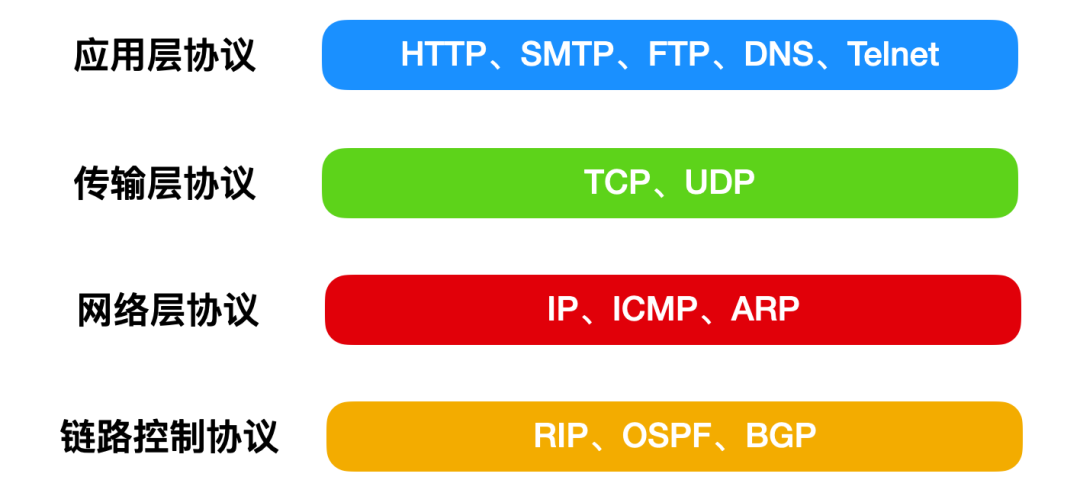 这里我们先来认识一下 TCP/IP 协议,TCP/IP 协议说的不仅仅只是 TCP 和 IP 这两种协议,实际上,TCP/IP 指的是协议簇,协议簇是啥呢?简单来说就是一系列协议的综合,如果下次再问你 TCP/IP 协议有哪些的话,可以把下面这张图甩给他
