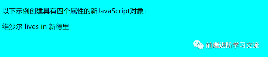 <script>// 创建对象var user = {firstName:"Json", lastName:"nhooo", age:22, location:"New Delhi"};//显示来自对象的数据document.getElementById("para").innerHTML = user.firstName +" lives in " + user.location;</script>