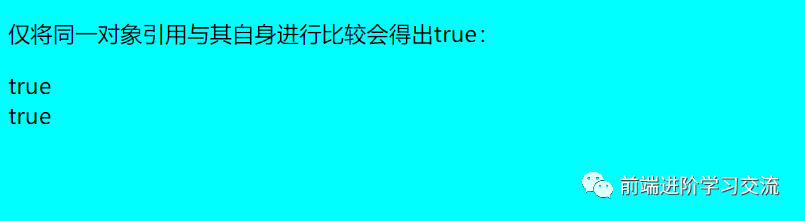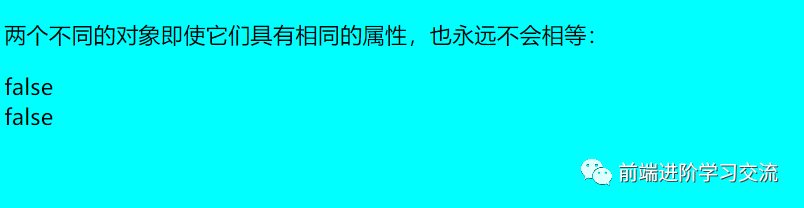 在JavaScript中,对象是引用类型。即使两个不同的对象具有相同的属性,它们也永远不会相等。