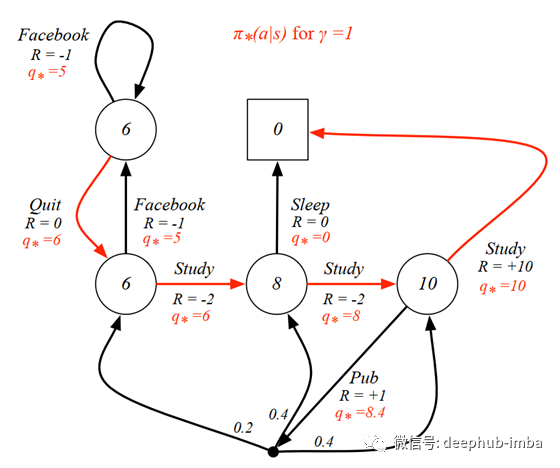 为了使情况更清楚,我们可以在下图中再次查看带有gamma 0.1的 MDP。假设在class3(红色圆圈)中,学生有50:50的政策。这意味着该学生有50%的机会Study或Pub。我们可以通过将每个动作之后的每个预期收益相加来计算状态值。