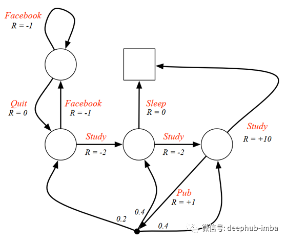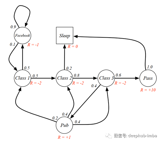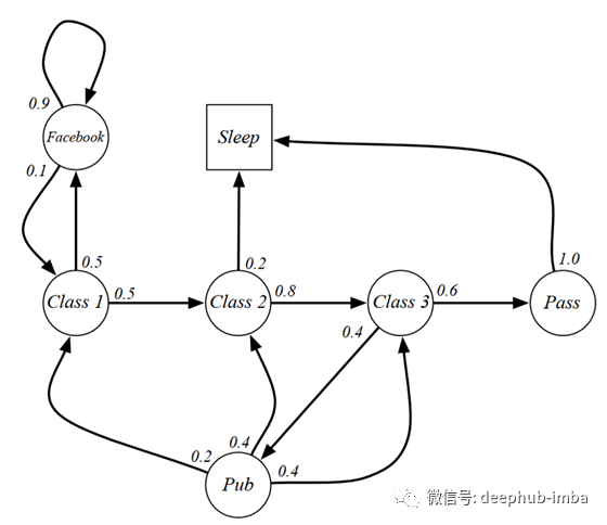 我们可以在下图中看到马尔科夫过程学生活动的一个例子。有几种状态,从class 1到最终状态Sleep。每个圆中的数字表示转移概率。