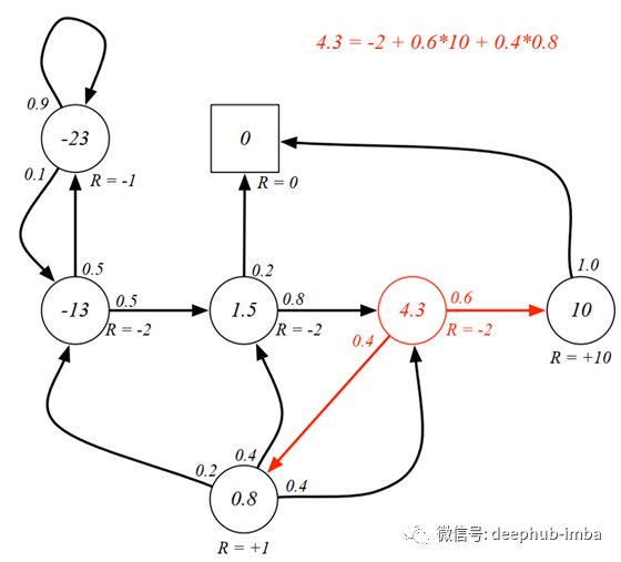 从class3 中我们可以看到,该值是通过将立即回报(-2)与下两个状态的期望值相加来计算的。为了计算下一状态的期望值,我们可以将转移概率与状态的 值相乘。因此,我们得到-2 +0.6* 10 +0.4*0.8等于4.3。