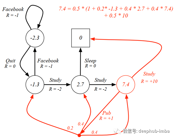 通过将动作概率与下一个状态的期望值(0.5 * 10)相乘,可以计算出Study的期望值。相反,Pub操作具有多个导致不同状态的分支。因此,我们可以通过将动作概率(0.5)乘以动作值,从Pub中计算出期望值。可以通过将即时奖励与来自所有可能状态的期望值相加来计算操作值。可以通过1 + 0.2 * -1.3 + 0.4 * 2.7 + 0.4 * 7.4进行计算。