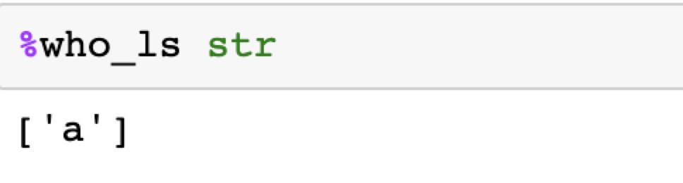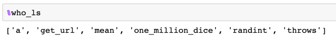 当我们的代码越写越多,定义的变量越来越多,有时候就容易忘记曾经起过哪些名字,这时候回去翻代码是痛苦的,而在Notebook中,可以使用%who_ls查看当前定义了多少变量