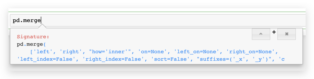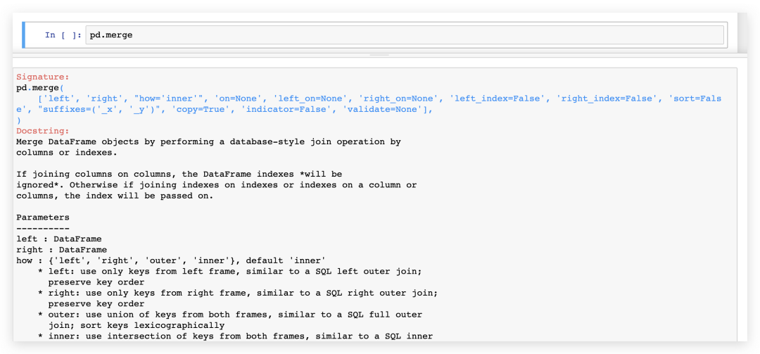 就像上图一样,直接显示pd.merge的用法,一目了然,点开还能查看更详细的解释👇