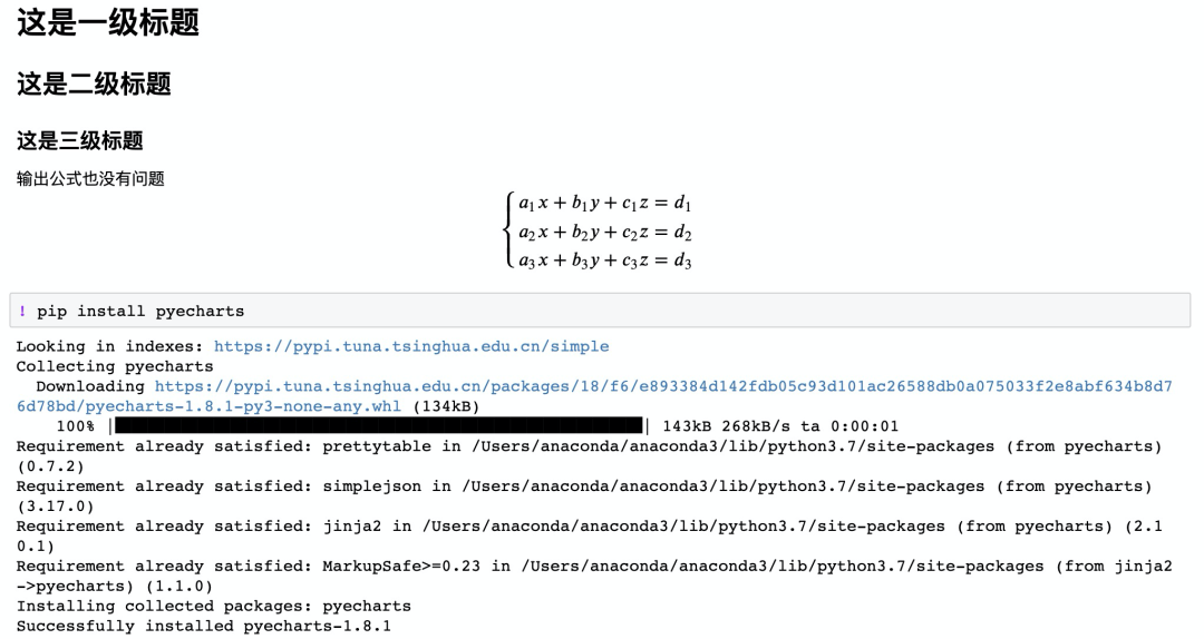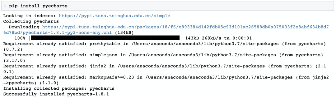 这时我们可以使用!pip install xxx 就可以直接在notebook将第三方库安装到本地,比如安装pyecharts