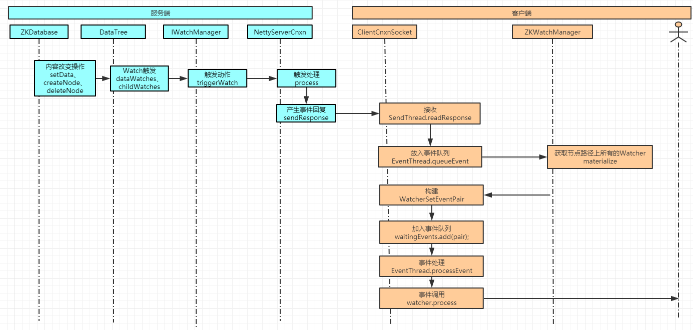 3.--> 客户端:同样在SendThread#readResponse中接收服务端的响应,解析是发现是notification类型响应,则构建一个WatcherEvent,通过eventThread.queueEvent(we)构建事件和对应Watch列表的WatcherSetEventPair对象,然后放入阻塞队列waitingEvents。构建WatcherSetEventPair时会查找所有在客户端ZKWatchManager中注册的对指定事件感兴趣的客户端Watch。EventThread则不断从waitingEvents取出事件,如果是WatcherSetEventPair则遍历调用Watch的process方法,该方法就是客户端需要重新的Watch监听处理方法。这样就完成了整个Watch触发机制