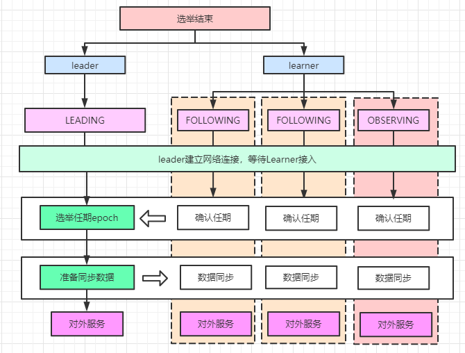 主要指2两种运行状态,在Leader失联时进入崩溃恢复状态,进行Leader选举,当选举完成后进入原子广播协议,Leader节点将事务请求广播到Follower节点