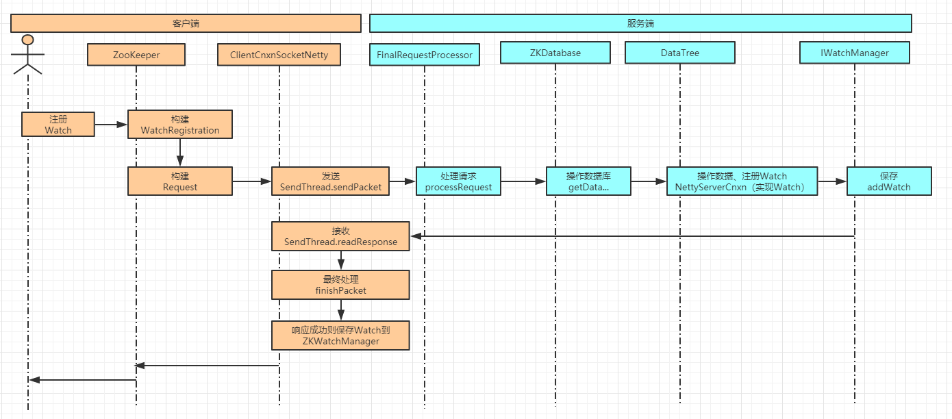 2.--> 服务端:在Zookeeper启动时会通过startServerCnxnFactory开启服务端连接,此时会开启AcceptThread来处理客户端的连接,客户端建立连接时会在这里处理,在接入时会构建SelectorThread来通过handleIO处理客户端的IO请求,然后将以此IO交互抽象为IOWorkRequest交给线程池去异步处理doWork-->doIO,然后开始解析网络消息包readPayload,然后解析消息包processPacket,解析之后放到阻塞队列submittedRequests中,队列请求在RequestThrottler中处理,然后submitRequestNow交给ZkServer的处理链去链式处理。处理链初始化时指定了FinalRequestProcessor会处理与数据库的交互。根据操作标识type不同有不同的解析流程并反序列化数据构建对应的Request。如果Request中存储watch标识则在DataTree中通过IWatchManager添加记录,记录包含监听的路径Path和客户端的连接ServerCnxn等,这步就是服务端注册,这里IWatchManager区分为当前节点和子节点2种。