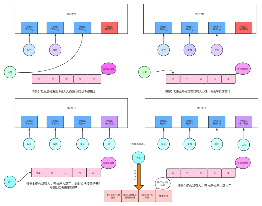 老王 取号后发现柜台都满了,等待座位席也满了, 临时窗口也人满了。这个时候银行经理给出了若干 解决策略。