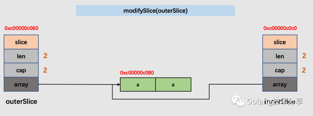 在Go函数中,函数的参数传递均是值传递。那么,将切片通过参数传递给函数,其实质是复制了slice结构体对象,两个slice结构体的字段值均相等。正常情况下,由于函数内slice结构体的array和函数外slice结构体的array指向的是同一底层数组,所以当对底层数组中的数据做修改时,两者均会受到影响。