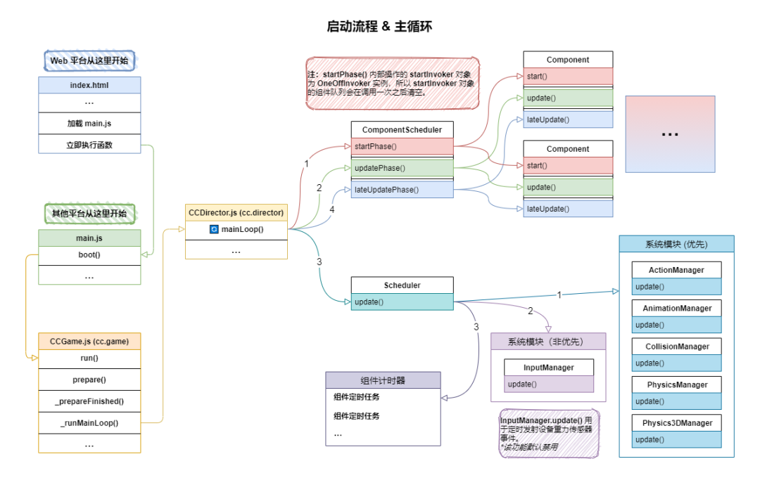 而在主循环的内容中还会涉及到:组件的生命周期和计时器、缓动系统、动画系统和物理系统等...