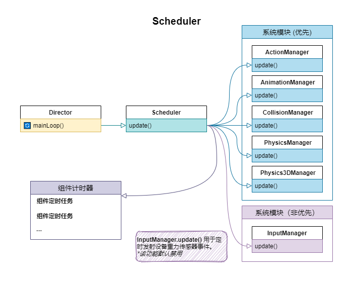 以上这些模块都以 cc.director._scheduler.scheduleUpdate() 的方式注册到调度器上,因为这些模块每一帧都需要进行更新。