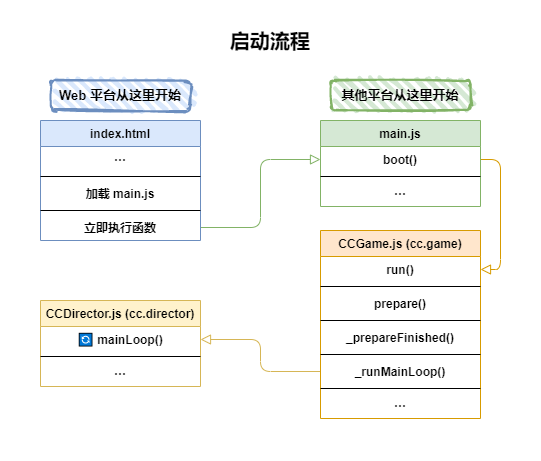 💡 对于非 Web 平台,会在定义完之后直接就调用 window.boot() 函数,所以 main.js 才是他们的起点。