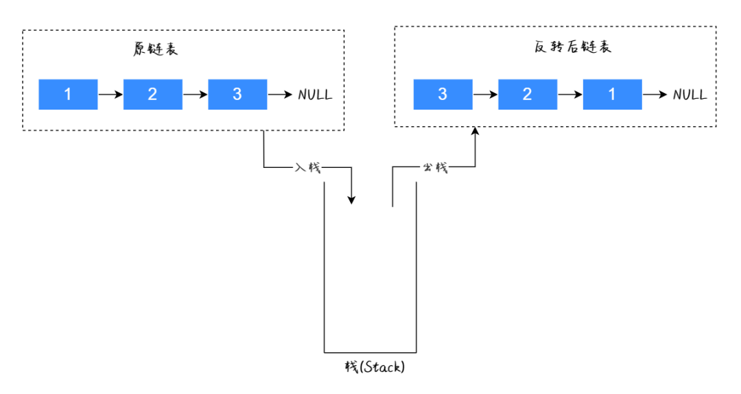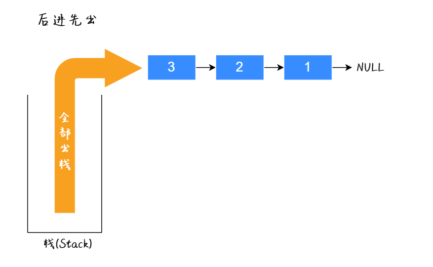 我们先用图解的方式来演示一下,使用栈实现链表反转的具体过程,如下图所示。
