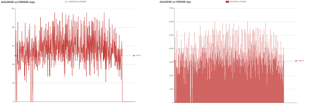 当磁盘整体流量达到磁盘阈值时会动态调整其他内部流量的阈值,从测试结果可以看到ec的流量受动态阈值调整存在一些波动,磁盘整体流量下去之后ec流量阈值又会恢复到最初阈值(10Mbps-600iops),但是可以看到整体磁盘的流量并没有控制在2Mbps-40iops以下,而是在这个范围上下波动,所以我们在初始化时需要保证设置的内部流量阈值小于磁盘的整体流量阈值,这样才能达到比较稳定的内部流量控制效果。