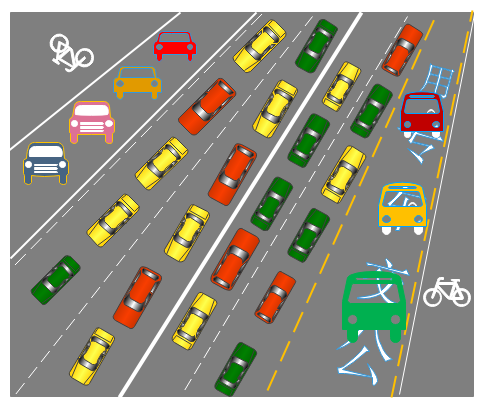从前面的图我们看到不管是什么车,都以自我为中心,不受任何约束,我们首先能先到的办法是对道路进行分类划分,比如分为公交车专用车道、小型车专用车道、大货车专用车道、非机动车道以及人行横道等,正常情况下公交车车道只允许公交车运行,而非机动车道上是不允许出现机动车的,这样我们可以保证车道与车道之间不受制约干扰。