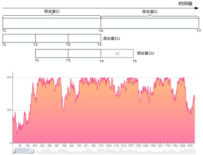但是大多数情况下我们会得到右侧的曲线图,即可能会出现流量翻倍的效果。比如前T1~T2时间段没有请求,T2~T3来了100个请求,全部通过。下一个限流窗口计数器清零,然后T3T4时间内来了100个请求,全部处理成功,这个时候时间段T4T5时间段就算有请求也是不能处理的,因此超过了设定阈值,最终T2~T4这一秒时间处理的请求为200个,所以流量翻倍。