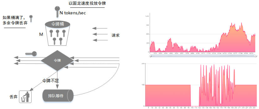 所有请求到达时,会先从令牌桶中获取令牌,拿到令牌则执行请求,如果没有获取到令牌则请求会被丢弃或者排队等待下一次尝试获取令牌。