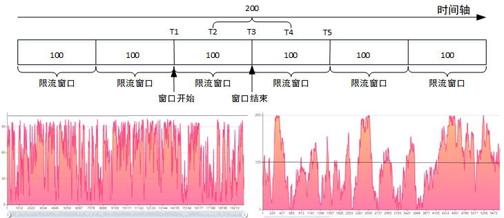 固定窗口算法的理想流量控制效果如上左侧图所示,假定设置1秒内允许的最大请求数为100,那么1秒内的最大请求数不会超过100。