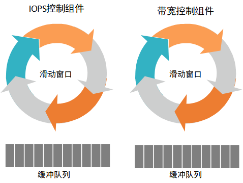 为了实现带宽与IOPS的同时控制,QoS组件将由两部分组成:IOPS控制组件负责控制读写的IOPS,带宽控制组件负责控制读写的带宽,带宽控制跟IOPS控制类似,比如带宽限制阈值为1Mbps,那么表示一秒最多只能读写1048576Bytes大小数据;假定IOPS限制为20iops,表示一秒内最多只能发送20次读写请求,至于每次读写请求的大小并不关心。