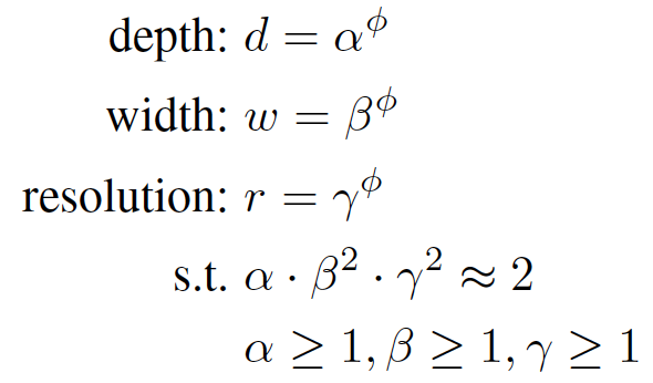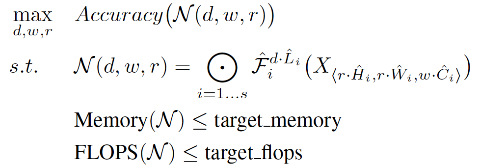 在网络结构搜索时,网络深度(depth)、网络宽度(width)和输入图像分辨率 (resolution)则为可变量,为了在固定计算资源的情况下建模三者之间的关联,作者又提出了以下的建模方式,用来表示三者之间的约束关系: