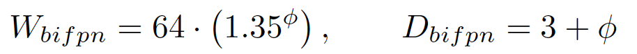 在此BiFPN layer的基础上,通过堆叠不同个数的BiFPN Layer即组成了BiFPN,在backbone使用不同复杂程度的EfficientNet的配置时,BiFPN同样沿用了EfficientNet的部分设计思想:通过类似的复合系数来控制BiFPN的宽度和深度,其具体公式如下: