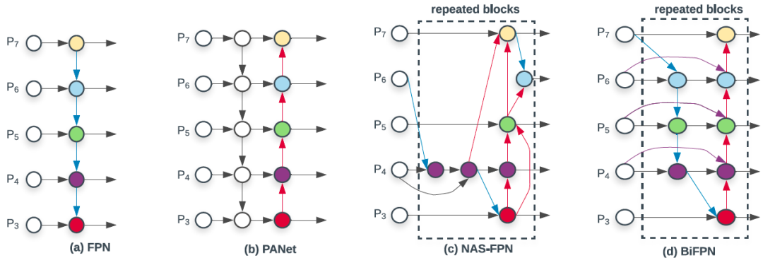 在PaddleDetection实现中,BiFPN实现如上链接中BiFPN所示,而参数修改则对应为配置文件efficientdet_d0.yml链接中的BiFPN处,其中repeat参数对应为BiFPN中“#layers”,num_chan参数则对应为BiFPN中“#channels”。总体来看,随着EfficientDet的backbone网络的不断复杂加深,BiFPN也随之不断继续堆叠,且通道数也同时随之增长。
