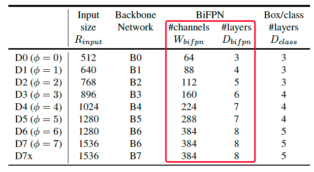 通过与EfficientNet类似的复合系数的控制,backbone和BiFPN的配比规模如下所示: