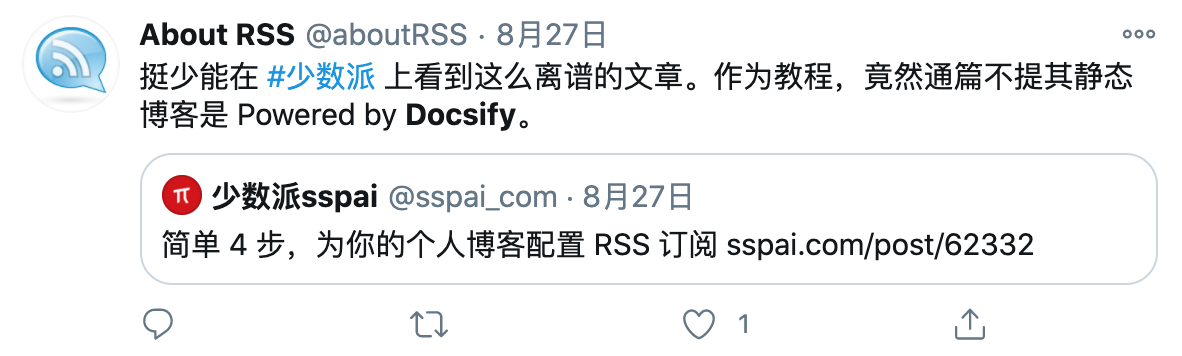 在推特上搜索 Docsify 的时候发现了一个在少数派上发布的配置RSS订阅的文章
