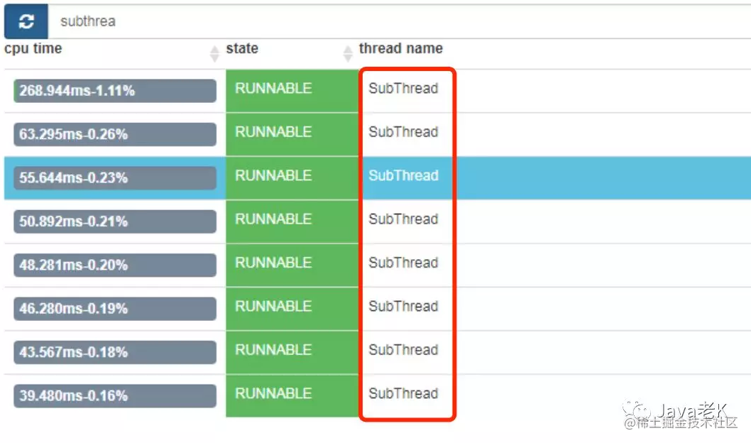 SubThread是我们自己定义的线程池里线程的名字,8个线程都是runnable状态,说明等待队列里已经塞满任务了,之前设置的队列长度是2048,也就是说还有2048个任务等待执行,这无疑加剧了整个接口的耗时。