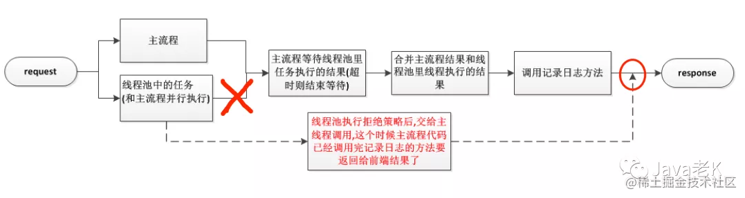 分析日志埋点可以推断出调用的时间点应该是已经调用完了记录日志的方法,要返回给前端结果的时才执行线程池里任务,此时记录日志的方法已调用过,不会再去打印日志了,而且子任务返回的结果也无法合并到主流程结果里,因为合并主流程结果和线程池任务返回结果的方法也在之前调用过,不会回过头来再调用了,大致流程如下: