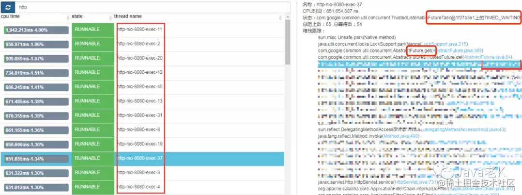 上线后的现象是使用线程池的接口整体响应时间变长,有的甚至到10秒才返回数据,通过线程dump分析发现有大量的线程都阻塞在future.get方法上,如下: