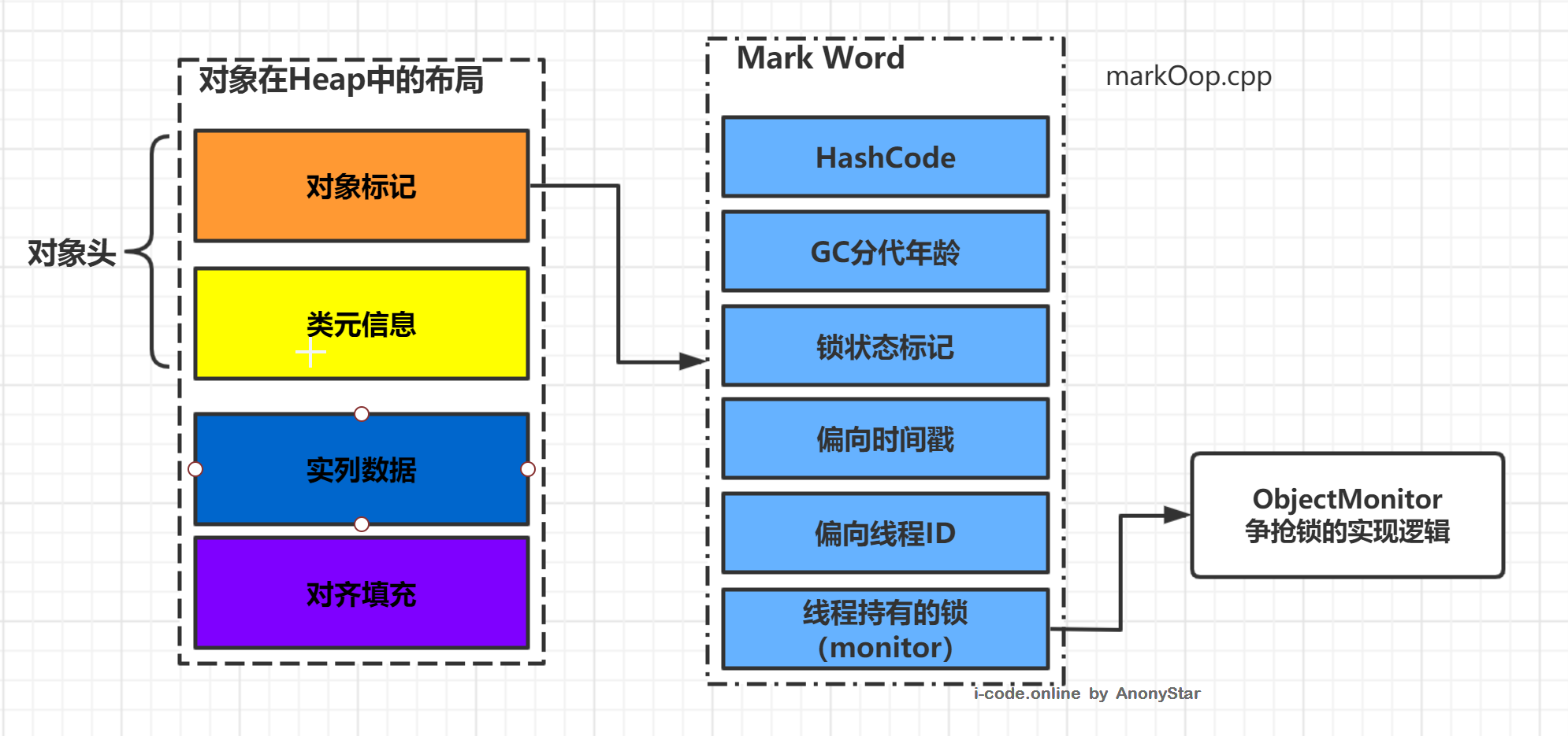 Heap中的布局,而不会涉及过多的关于对象的创建过程等细节,这些内容我们再单独文章详细阐述,可以关注i-code.online博客或wx"云栖简码" -
