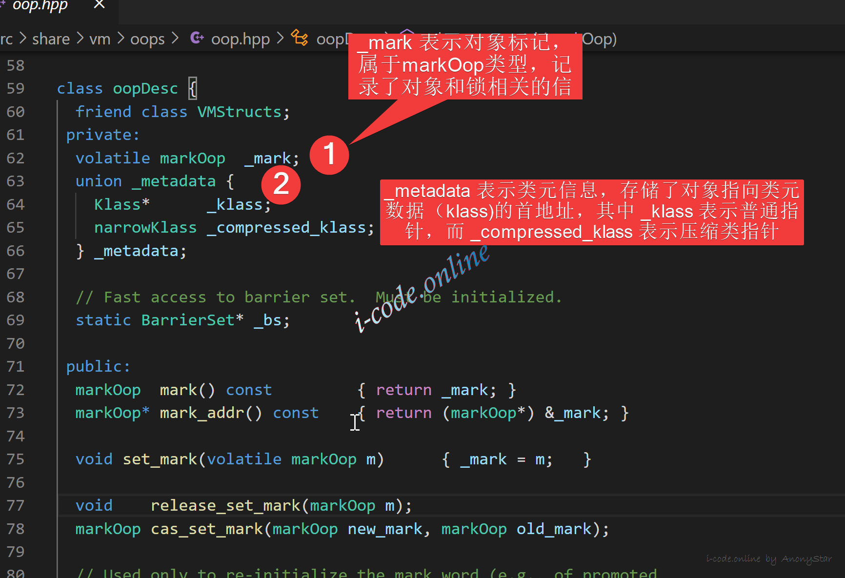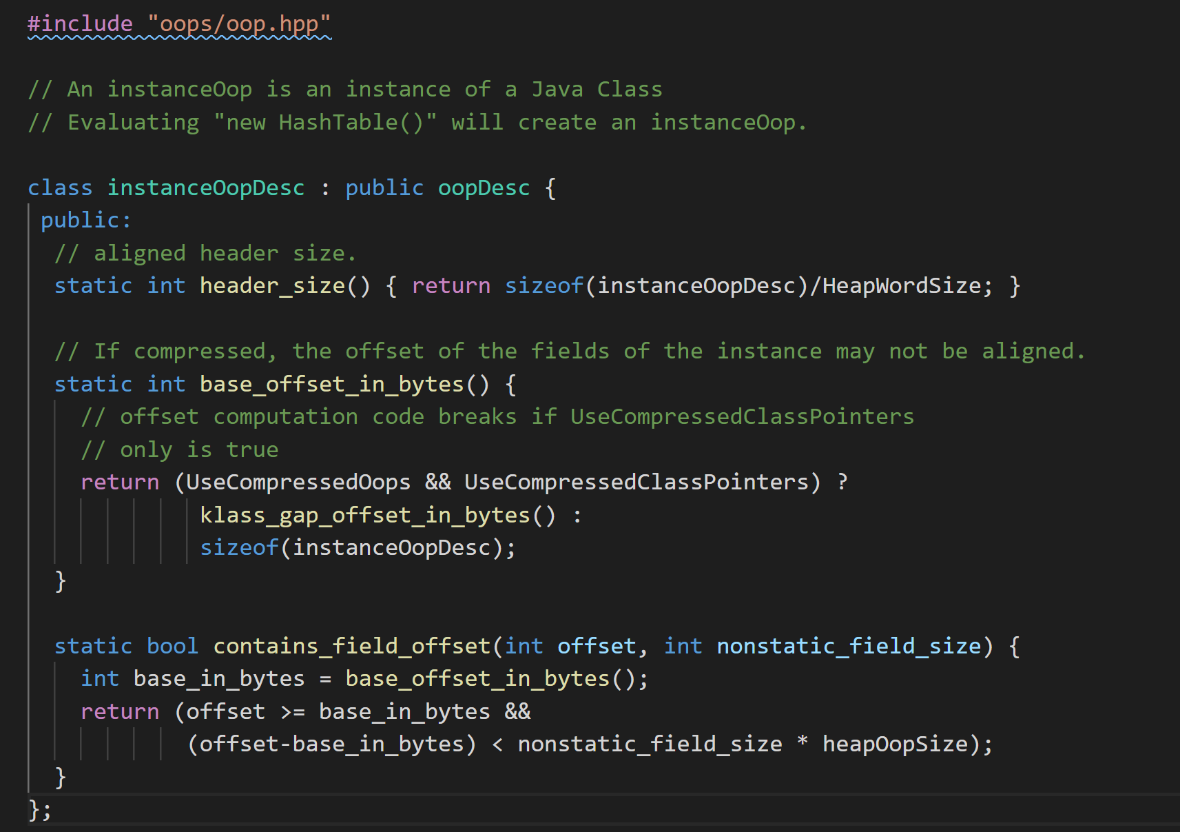 instanceOopDesc继承了oopDesc,而oopDesc则定义在oop.hpp中, - 上述图示中我们可以看到相关信息,具体也注释了文字,那么接下来我们要探索一下