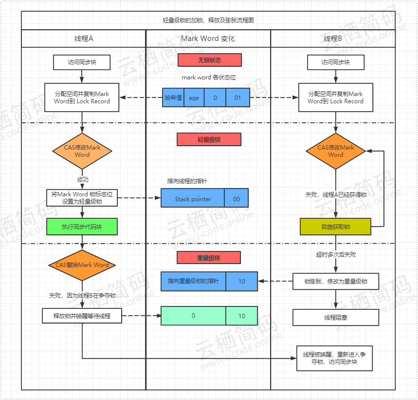 - 下面通过完整的流程图来直观看一下轻量级锁的加锁解锁及膨胀过程